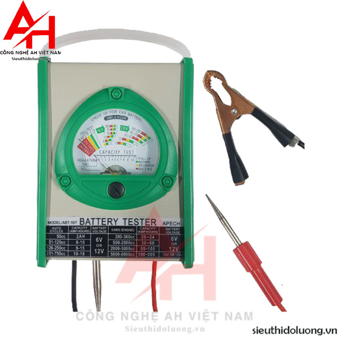 Thiết bị kiểm tra ắc quy APECH ABT-107 bao gồm kẹp vào 2 cực nguồn ắc quy, sau đó dựa trên chất lượng hiện tại của ắc quy để hiển thị bằng kim trên màn hình: bình ắc quy đầy ( vạch trắng), bình thường (xanh), phải sạc lại (màu vàng), ắc quy đã bị hỏng (màu đỏ).