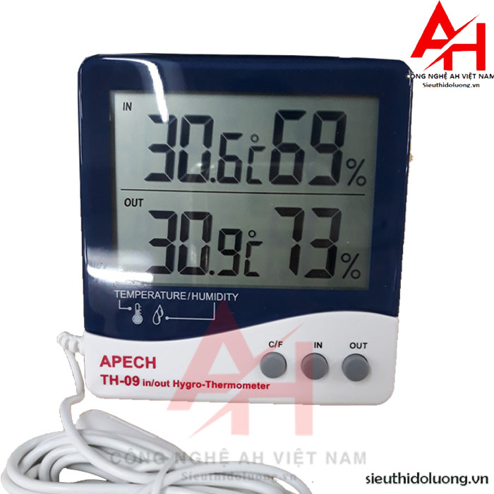 Nhiệt ẩm kế điện tử cao cấp dạng để bàn, treo tường APECH TH-09 dùng để đo nhiệt độ, độ ẩm trong phòng, nhà xưởng, tủ lạnh APECH TH-09 cực kỳ chính xác. Với cảm biến dài hơn 2m không chỉ đo được nhiệt độ tại nơi đặt máy mà còn có thể đo ở vị trí cách xa nơi đặt máy ở khoảng cách khá xa.