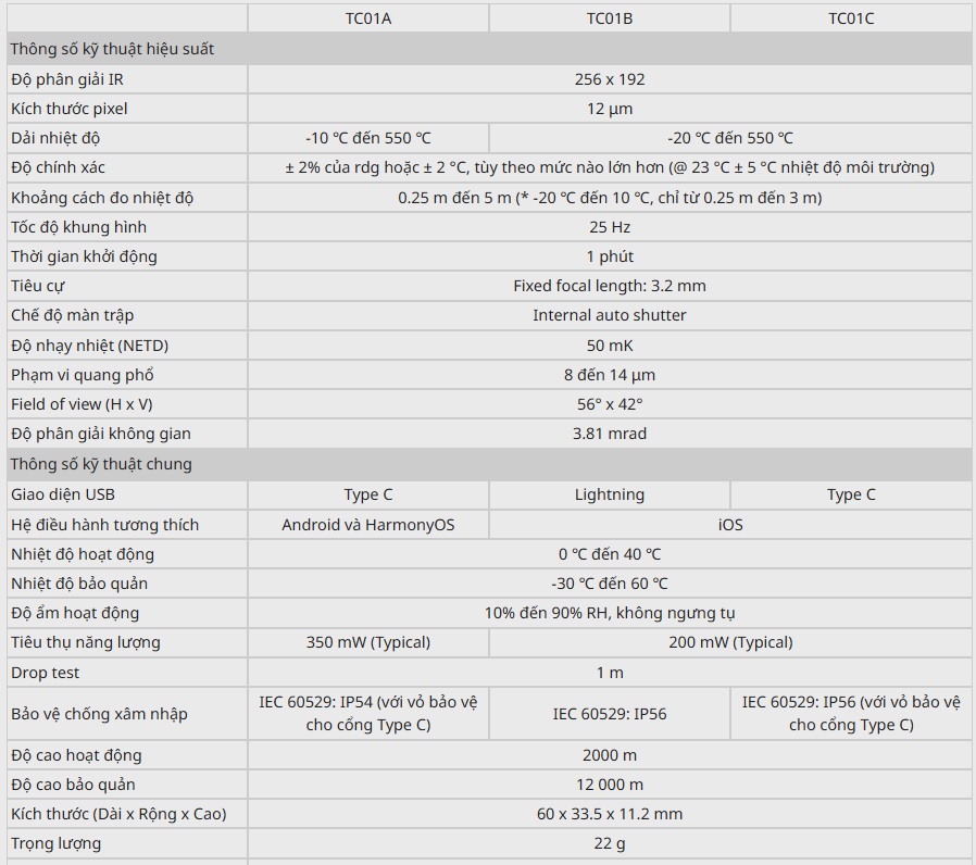 III. ⭐ Thông số kỹ thuật chi tiết Camera nhiệt mini thông minh cho iPhone/iPad – Fluke TC01C