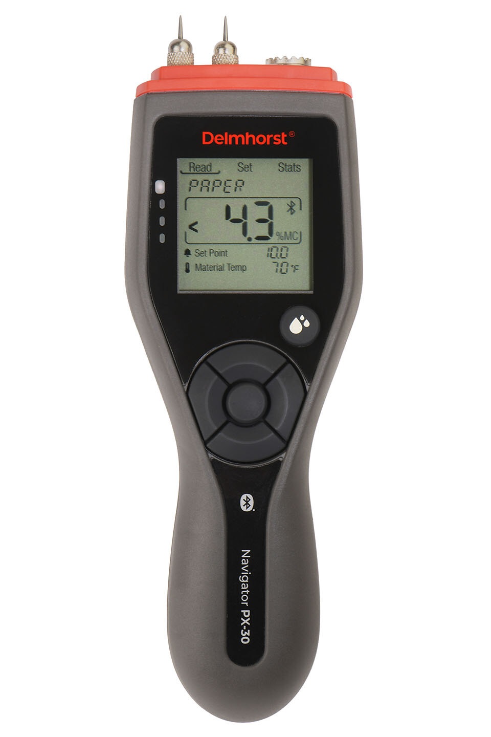 PX-30 mạnh mẽ kết hợp các yếu tố thiết kế và chức năng của PX-20 và nhiều hơn nữa với việc bổ sung hai thang đo độ ẩm – một cho giấy đóng kiện và một thang đo tham chiếu cho các số đọc tương đối. Kết nối Bluetooth® với ứng dụng Delmhorst EDGE ® nâng cao khả năng đảm bảo các số đọc chính xác và xuất dữ liệu từ bất kỳ đâu để lập tài liệu và phân tích.