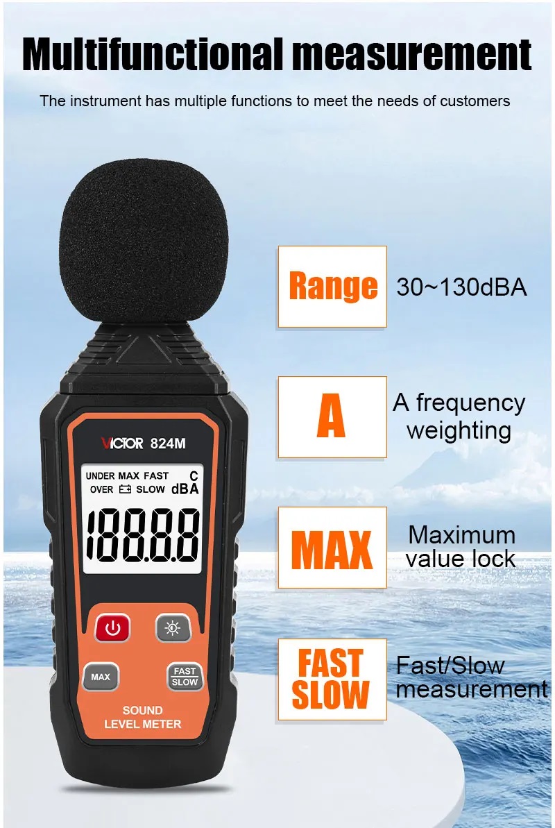 Victor 824M là máy đo độ ồn (Sound Level Meter) cầm tay, sử dụng để đo cường độ âm thanh theo đơn vị dB (decibel). Thiết bị được ứng dụng rộng rãi trong nhà xưởng, công trình xây dựng, môi trường lao động, phòng máy, trường học, bệnh viện và các hoạt động kiểm tra tiếng ồn theo tiêu chuẩn an toàn.