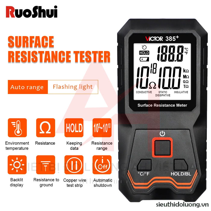 * RuoShui 385 áp dụng phương pháp cảm biến điện cực song song D-257 tiêu chuẩn ASTM, có thể dễ dàng và liên tục đo các loại dẫn điện, loại phóng tĩnh điện và các bề mặt loại cách điện.