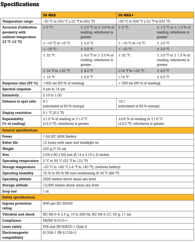 2. Thông số kỹ thuật Fluke 59 MAX / Fluke 59 MAX+