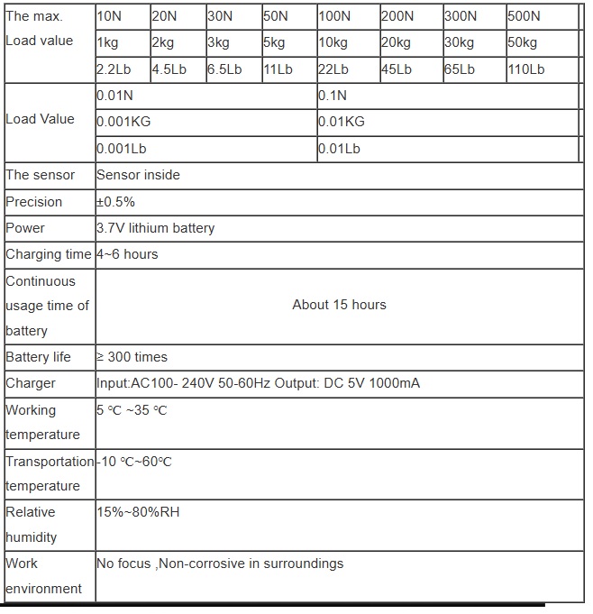 Thông số kỹ thuật của máy đo sức căng vật liệu VICTOR 500N (50kg)